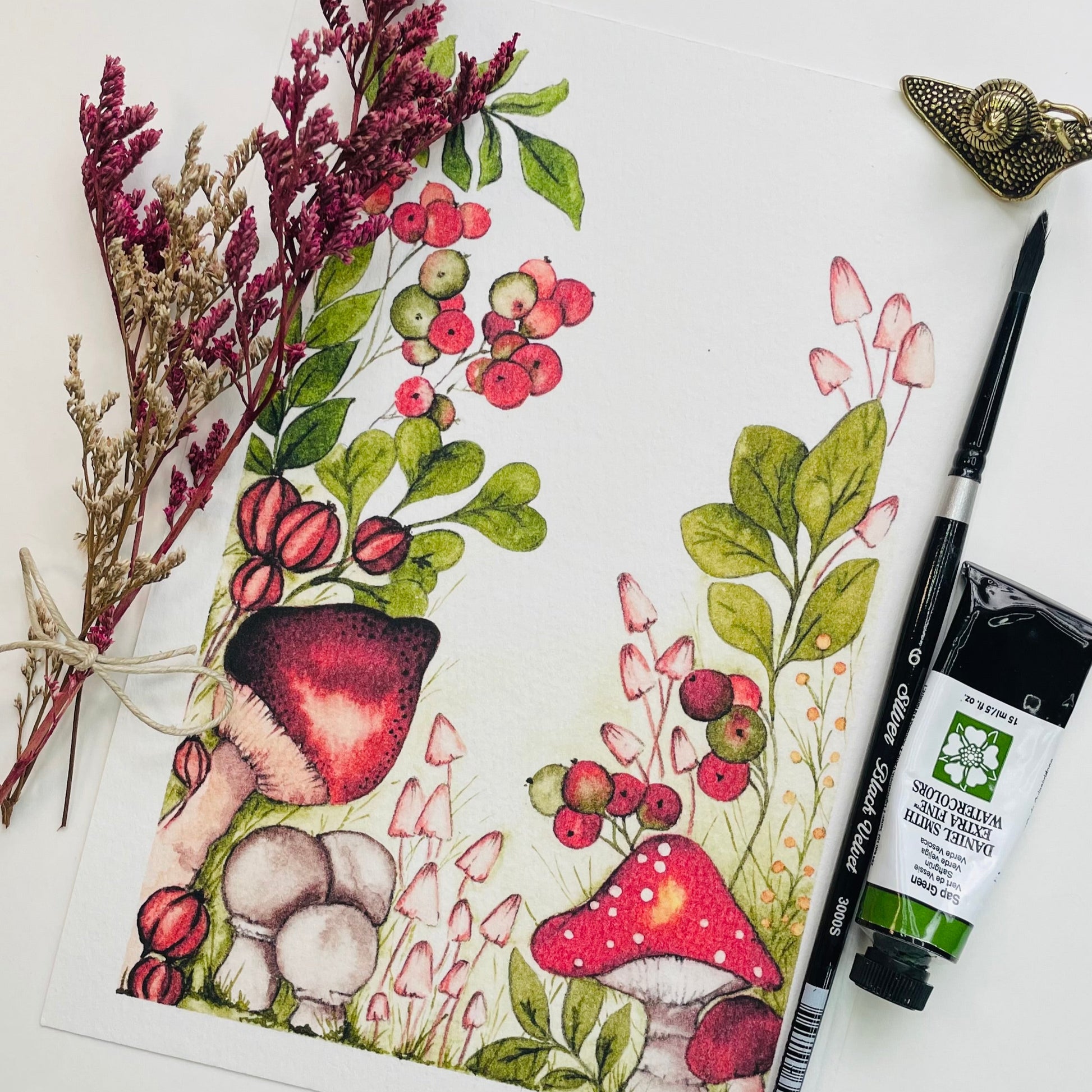 - Features toadstools, woodland berries, and forest flora in a soft botanical palette