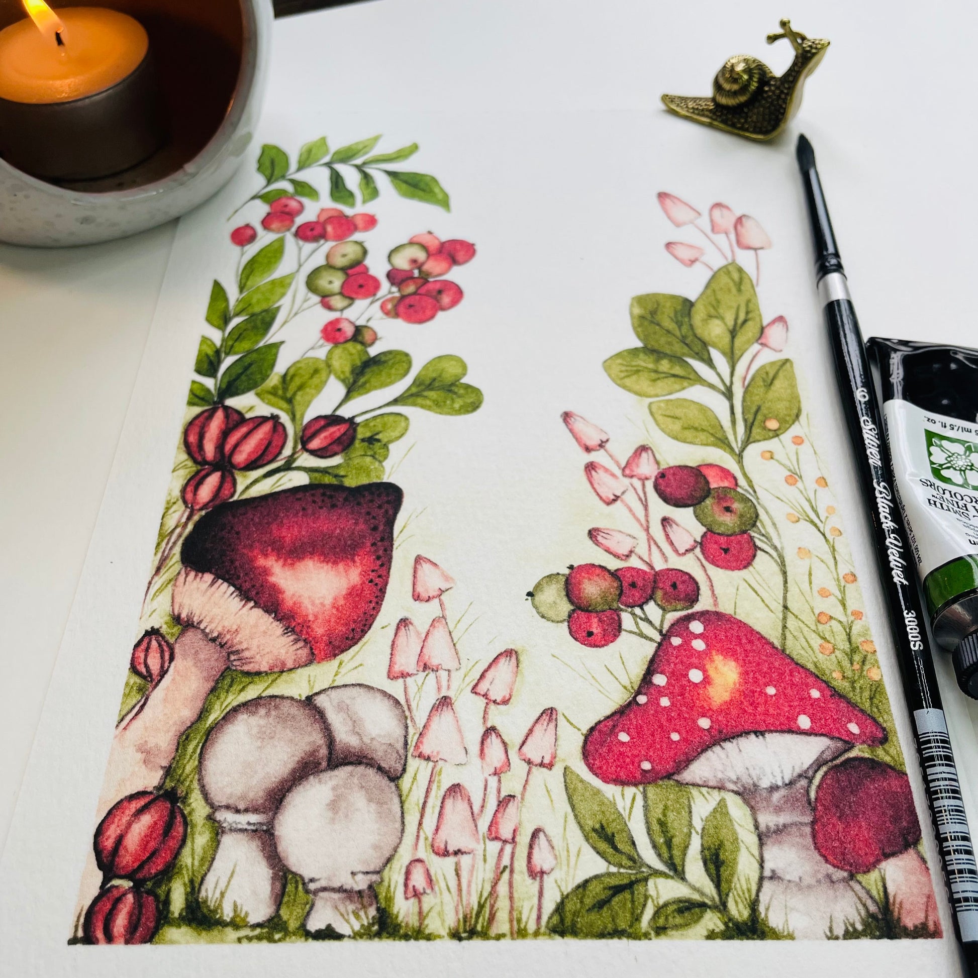 Bring the magic of the forest into your home with this enchanting A5 art print featuring a ring of vibrant red toadstools nestled around wild woodland foliage, juicy berries, and tiny, curious mushrooms. Lovingly hand-painted and professionally printed on 300gsm textured watercolour paper, this piece is a celebration of nature’s quiet, whimsical beauty.
