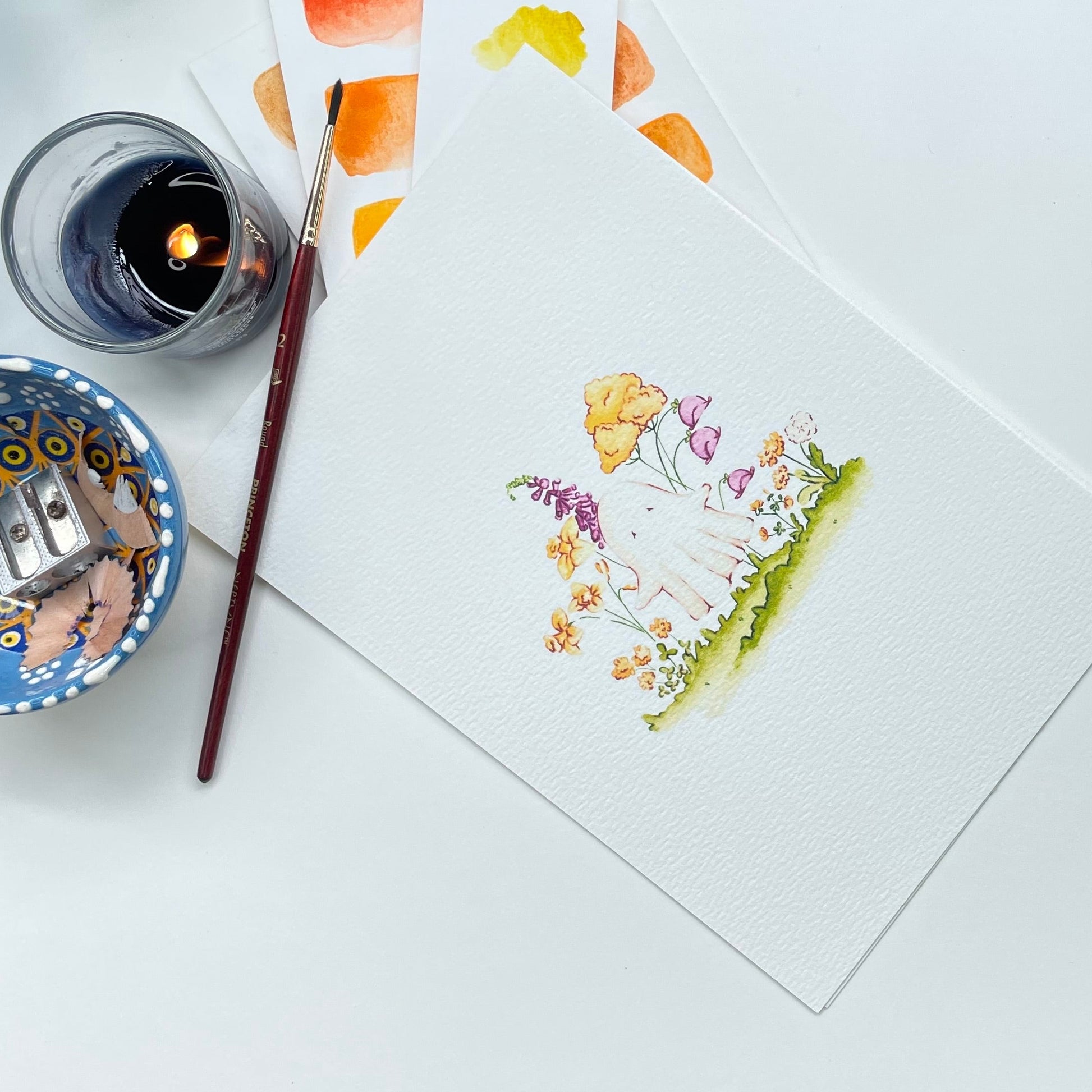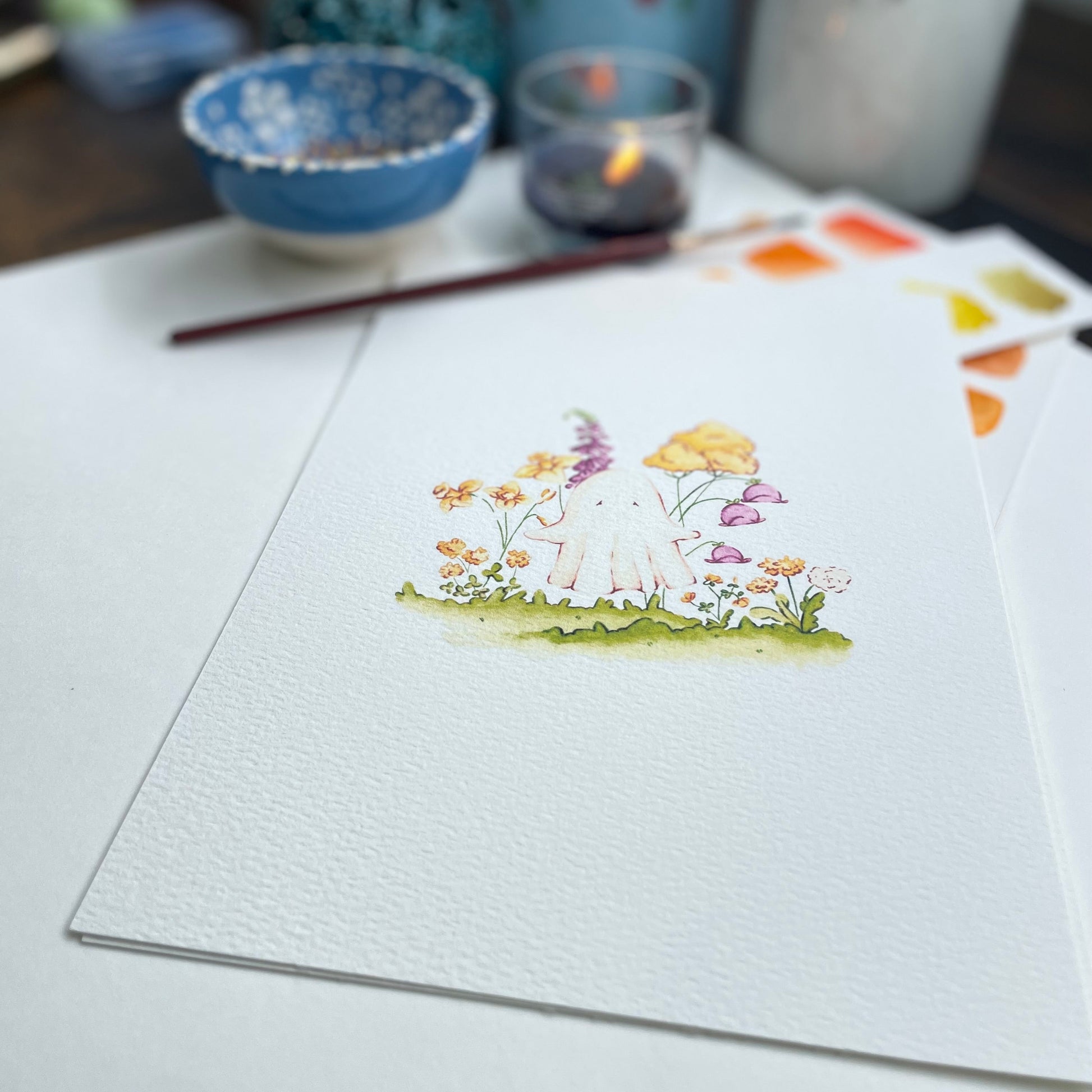 Whimsical watercolour art print of a small ghost in a field of flowers. A beautiful alternative for Halloween and autumn lovers. A unique option for nursery and playroom decor. Perhaps a great gift for illustration lovers and collectors of alternative spooky art.