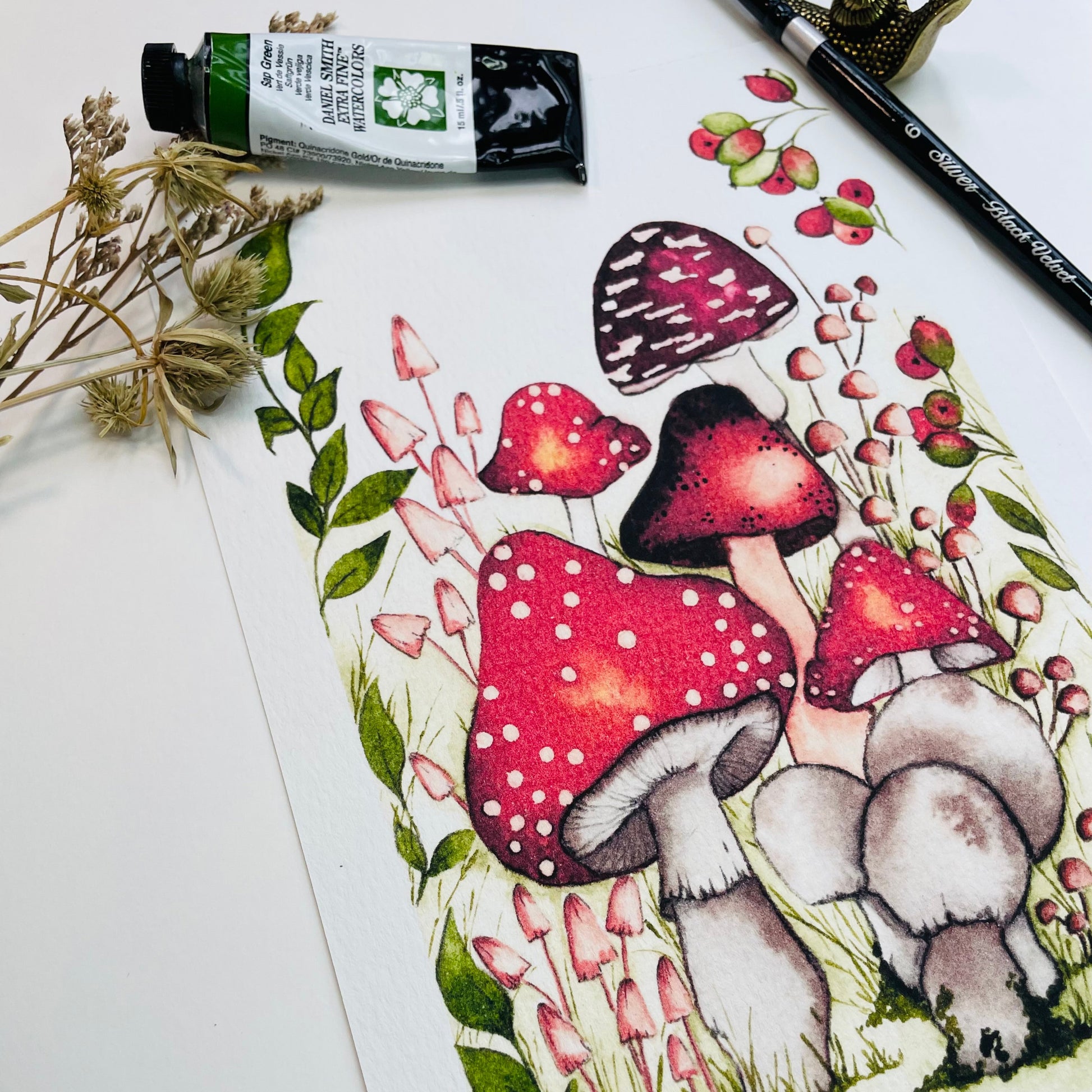 Bring the magic of the forest home with this enchanting A5 watercolour art print, featuring hand-painted woodland mushrooms, toadstools, and foliage. Illustrated in rich hues on 300gsm textured paper, it celebrates the hidden wonders of the woodland floor.