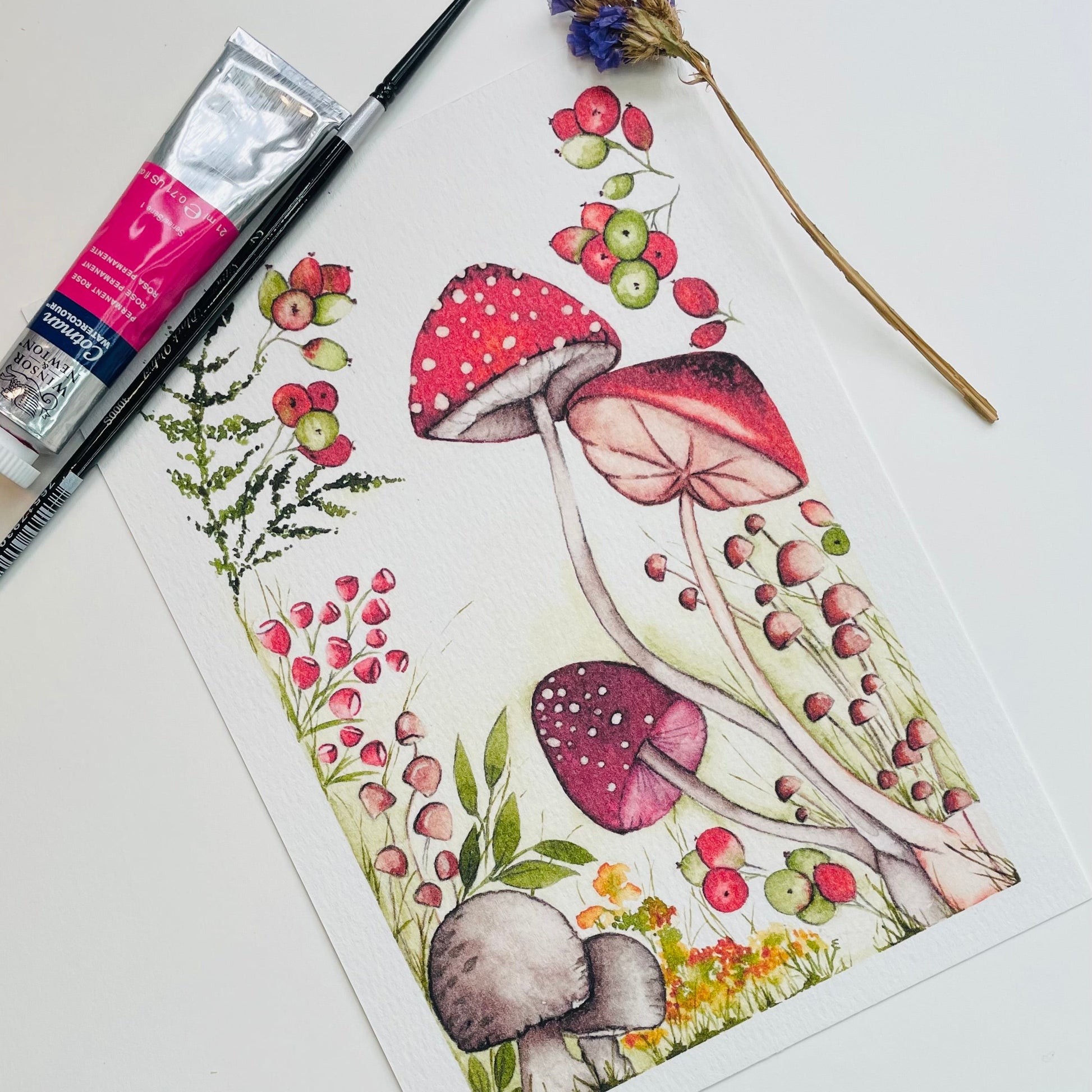 Bring a dash of forest magic into your home with this charming A5 watercolour art print, featuring three tall, slender toadstools standing proudly amidst a dreamy woodland scene.
