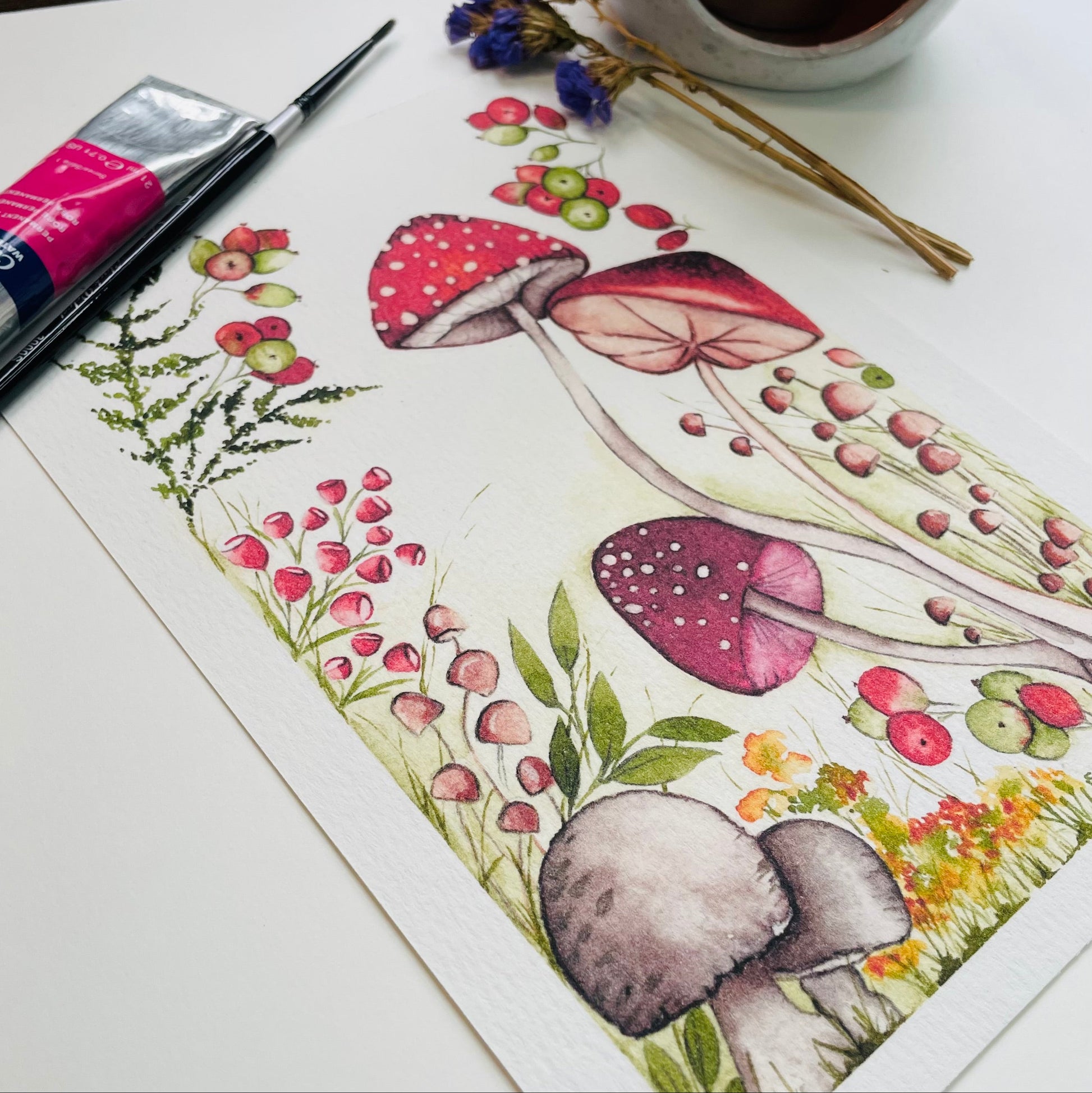 Framed by delicate sprays of berries, ferns, and miniature mushrooms, this enchanting composition captures the quiet wonder of the forest floor — where fairies might dwell and secrets softly bloom.