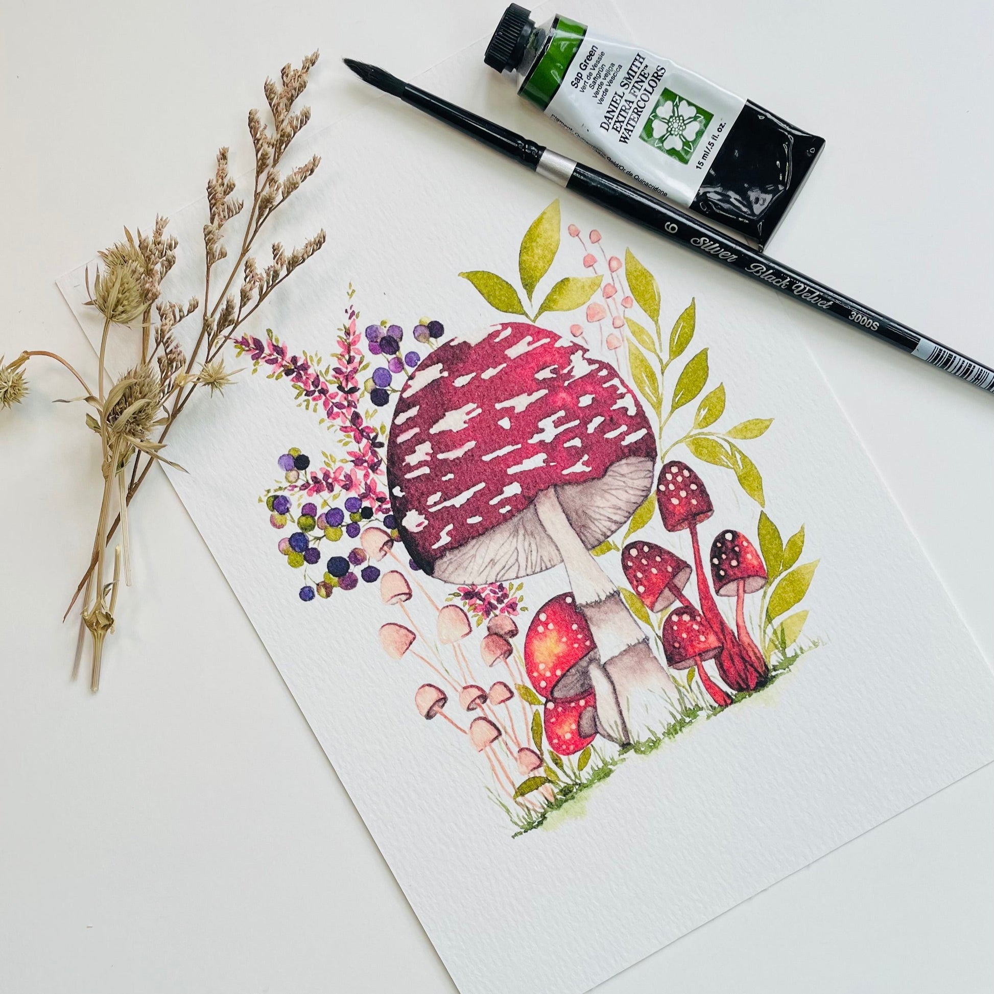 Add a splash of forest magic with this charming woodland mushroom print! Featuring a tall red-purple toadstool surrounded by smaller mushrooms, leaves, and berries, this hand-painted watercolour on thick 300gsm A5 paper brings cosy woodland vibes to any space.
