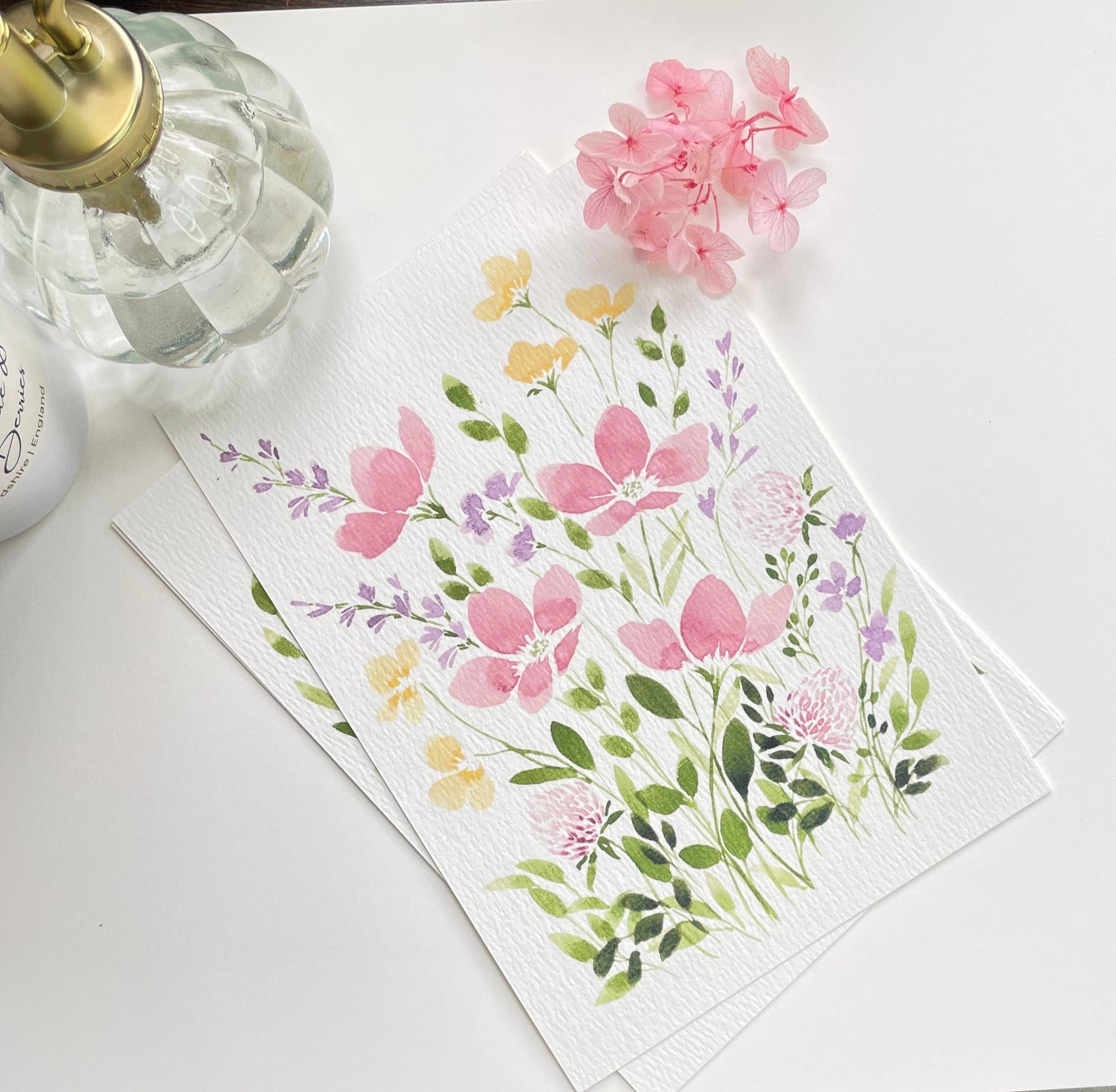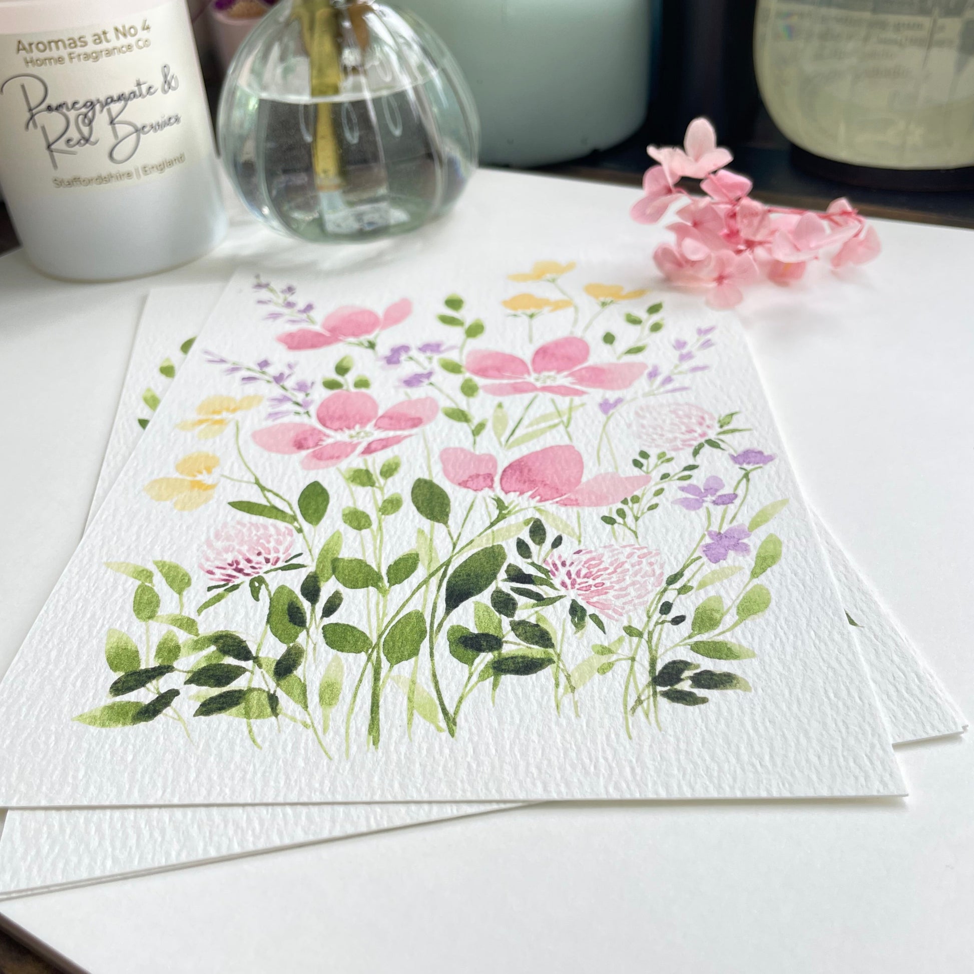 Bring meadow magic into your home with this whimsical A5 watercolour print of wildflowers in soft purples, sunny yellows, and blousy pinks. Inspired by the untamed beauty of an English wildflower meadow, each brushstroke captures nature in bloom.